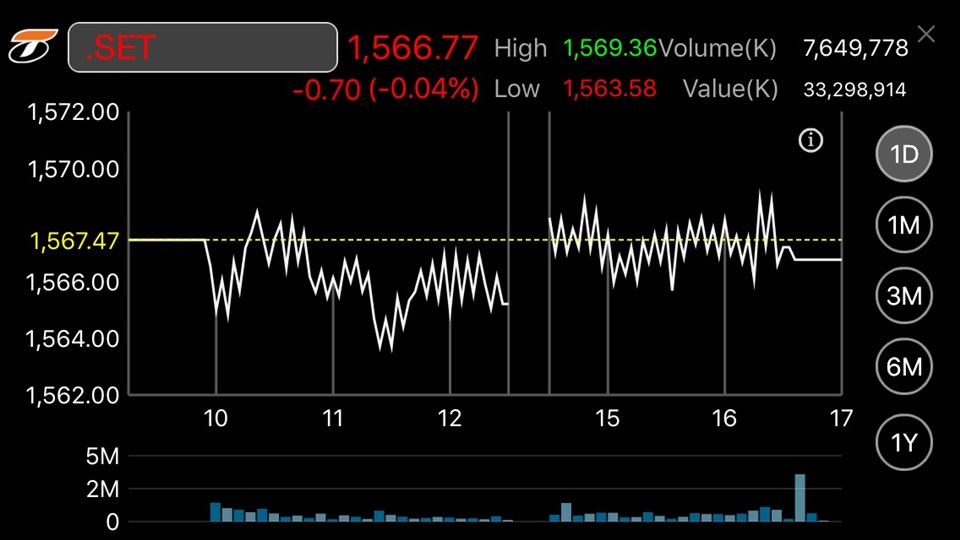 ขณะที่ดัชนีทำระดับต่ำสุดของวันที่ 1,563.58 จุด