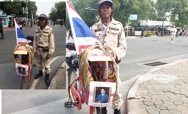 นายพัฒนะ พิมพ์แดง อาสาสมัครตำรวจ วัย 55 ปี ปั่นจักรยานจาก อ.สากเหล็ก จ.พิจิตร มายังพระบรมมหาราชวัง นานกว่า 6 วันเพื่อมากราบถวายสักการะเบื้องหน้าพระโกศพระบรมศพพระบาทสมเด็จพระปรมินทรมหาภูมิพลอดุลยเดชเป็นครั้งสุดท้าย
