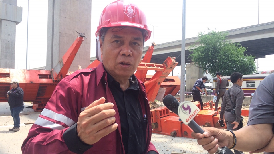 นายธเนศ กล่าวว่า ตรวจสอบข้อมูลเบื้องต้น พบว่าขณะเกิดเหตุตัวรองรับโครงเหล็ก หรือที่เรียกว่าตัว support ซึ่งวางอยู่บนหัวเสาเกิดล้มลงมาขณะเลื่อนโครงเหล็ก ทำให้คนงานที่กำลังปฏิบัติหน้าที่ร่วงลงมาพร้อมตัว support เสียชีวิตทันที 3 ราย ดังนั้นจะต้องตรวจสอบเหล็กยึด 6 จุดว่าได้มาตรฐานหรือไม่ ขาดเพราะสาเหตุอะไร เพราะขณะนี้พบเส้นเหล็กเพียง 1 เส้น หายไป 5 เส้น อย่างไรก็ตาม ทั้งหมดเป็นเพียงคำสันนิษฐานและคำแนะนำของวิศวกรรมสถานฯ เพราะฝ่ายที่จะต้องไปตรวจสอบคือบริษัทที่เป็นผู้รับผิดชอบในการก่อสร้าง