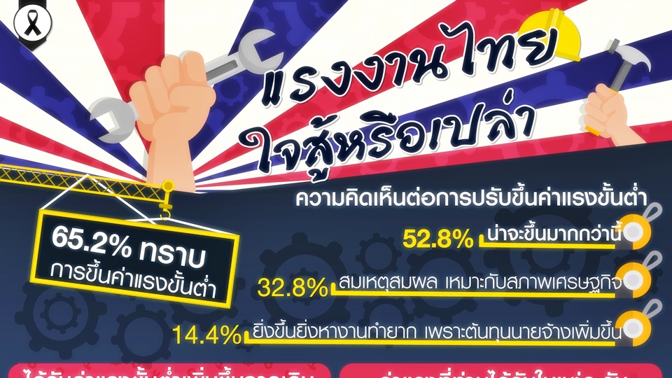 เนื่องในวันที่1 พ.ค.ที่จะถึงนี้ เป็นวันแรงงานแห่งชาติ กรุงเทพโพลโดยศูนย์ วิจัยมหาวิทยาลัยกรุงเทพ สำรวจความคิดเห็นประชาชนเรื่อง ‘แรงงานไทย ใจสู้หรือเปล่า’ โดยเก็บข้อมูลผู้ใช้แรงงานในพื้นที่ กรุงเทพฯและปริมณฑล จำนวน 1,149 คน พบว่า ผู้ใช้แรงงานร้อยละ 65.2 รับทราบการปรับขึ้นค่าแรงขั้นต่ำจากเดิม 300 บาทเป็น 305-310 บาท ตามที่รัฐมีมติปรับขึ้นค่าจ้างใหม่ เริ่ม 1 ม.ค.2560 ที่ผ่านมา มีเพียงร้อยละ 34.8 ไม่ทราบข่าว และเมื่อถามต่อว่าได้รับค่าจ้างขั้นต่ำที่เพิ่มขึ้นจากเดิม 300เป็น 310 บาทแล้วหรือไม่ ร้อยละ 78.9 ได้รับแล้ว ขณะที่ร้อยะ 21.1 ระบุยังไม่ได้รับ