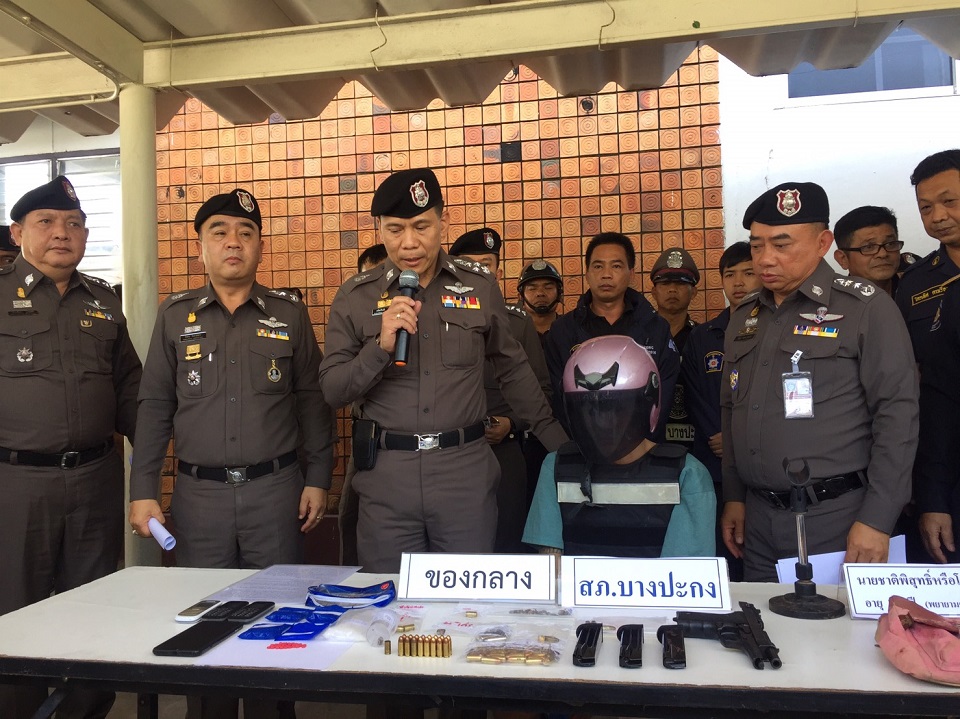 เมื่อเวลา 14.30 น. (30 เม.ย.) พล.ต.อ.เฉลิมเกียรติ ศรีวรขาน รองผู้บัญชาการตำรวจแห่งชาติ พร้อม พล.ต.ท.จิตติ รองบางยาง ผู้บัญชาการตำรวจภูธรภาค 2 และ พล.ต.ต.ธีรพล จินดาหลวง ผู้บังคับการตำรวจภูธรจังหวัดฉะเชิงเทรา แถลงที่ สภ.บางปะกง กรณีจับกุมนายชาติพิสุทธิ์ หรือโอ แก้วพิลึก อายุ 28 ปี ชาว จ.ชลบุรี พร้อมของกลางรถยนต์ สีดำ ติดป้ายทะเบียนหน้า ชจ 805 กรุงเทพมหานคร ทะเบียนหลัง ขจ 805 กรุงเทพมหานคร และชิงทรัพย์รถยนต์ผู้อื่น รุ่นวีออส ทะเบียน กร 8474 ชลบุรี ปืนพกขนาด 9 มม. 1 กระบอก กระสุน 45 นัด โทรศัพท์มือถือ 4 เครื่อง ยาบ้า 645 เม็ด และไอซ์ 61.29 กรัม