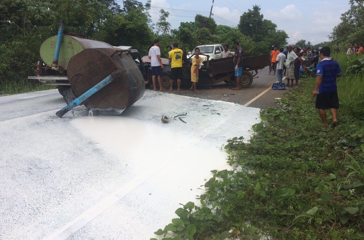 นครศรีธรรมราช 1 พ.ค.- รถกระบะบรรทุกน้ำยางชนกันอย่างจังกลางถนนบางขัน-นครศรีฯ คนขับดับ 1 บาดเจ็บอีก 2