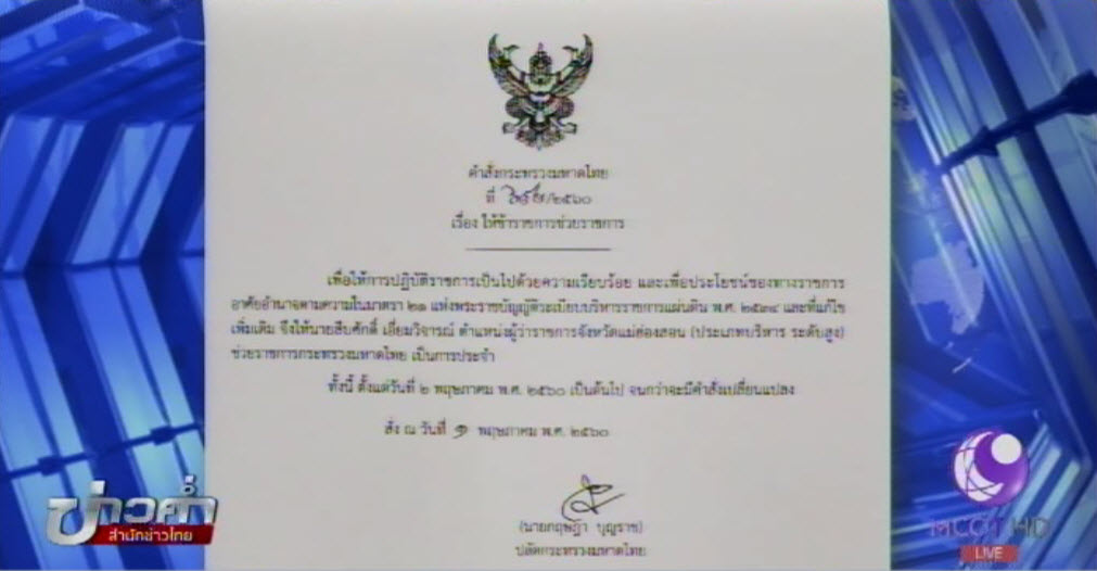 นายกฤษดา บุญราช ปลัดกระทรวงมหาดไทย มีคำสั่งกระทรวงมหาดไทยที่ 692/2560 ลงวันที่ 1 พฤษภาคม 2560 เรื่องให้ข้าราชการช่วยราชการ โดยหนังสือคำสั่งระบุว่า เพื่อให้การปฏิบัติราชการเป็นไปด้วยความเรียบร้อย และเพื่อเป็นประโยชน์ของทางราชการอาศัยอำนาจตามความในมาตรา 21 แห่งพระราชบัญญัติระเบียบบริหารราชการแผ่นดิน พ.ศ.2534 และแก้ไขเพิ่มเติม จึงให้นายสืบศักดิ์ เอี่ยมวิจารณ์ ตำแหน่งผู้ว่าราชการจังหวัดแม่ฮ่องสอน (ประเภทบริหารระดับสูง) มาช่วยราชการกระทรวงมหาดไทยเป็นการประจำ ทั้งนี้มีผลตั้งแต่วันที่ 2 พฤษภาคม 2560 จนกว่าจะมีการเปลี่ยนแปลง