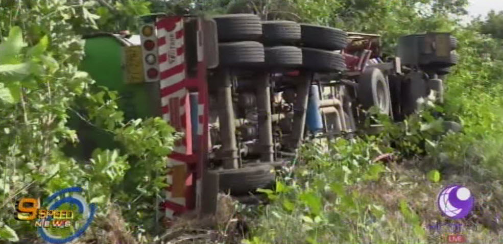 นครราชสีมา 2 พ.ค. – เกิดอุบัติเหตุรถพ่วงบรรทุกน้ำมัน 38,000 ลิตร พลิกคว่ำบนถนนมิตรภาพ อ.โนนสูง จ.นครราชสีมา ทำให้น้ำมันดีเซลรั่วไหลออกจากวาล์วถังน้ำมัน ปะปนไปกับน้ำในแอ่งข้างทาง เจ้าหน้าที่ต้องนำกรวยสีส้มวางเป็นแนวกั้นริมถนน ป้องกันอุบัติเหตุซ้ำซ้อน และรอถ่ายเทน้ำมันออกจากรถ ด้านคนขับอ้างว่า มีรถเก๋งแซงตัดหน้ากระชั้นชิด จึงหักหลบกะทันหัน รถหลุดโค้งชนกับต้นไม้ก่อนพลิกคว่ำ แต่ไม่ได้รับบาดเจ็บ. – สำนักข่าวไทย