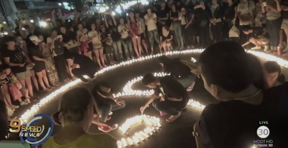 พ่อค้าแม่ค้าในงานถนนคนเดินเชียงใหม่ รวมทั้งนักท่องเที่ยวชาวไทยและต่างประเทศกว่าหมื่นคน ร่วมกันร้องเพลงสรรเสริญพระบารมี ก่อนยืนสงบนิ่งเป็นเวลา 90 วินาที และร่วมกันจุดเทียนตลอดงานถนนคนเดินกว่า 15,000 ดวง เป็นแนวยาวไปตามถนนราชดำเนิน-ถนนพระปกเกล้า พร้อมจุดผางประทีปบริเวณสี่แยกกลางเวียง เป็นรูปเลข 9 ไทย เพื่อถวายความอาลัยและแสดงความจงรักภักดีพระบาทสมเด็จพระปรมินทรมหาภูมิพลอดุลยเดช.-สำนักข่าวไทย