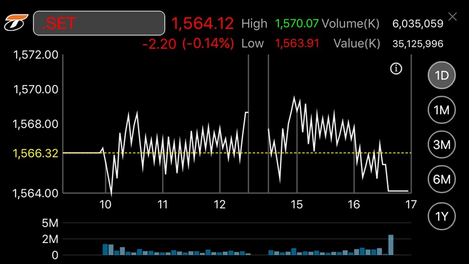 ผู้สื่อข่าวรายงานว่าดัชนีหุ้นไทยปิดการซื้อขายที่ระดับ 1,564.12 จุด ลดลง 2.20 จุด หรือร้อยละ 0.14 มูลค่าการซื้อขาย 35,126.09 ล้านบาท โดยหุ้นไทยวันนี้อยู่ในช่วงแคบ ๆ ดัชนีสูงสุดของวันที่ระดับ 1,570.07 จุด และต่ำสุดของวันที่ระดับ 1,563.91 จุด