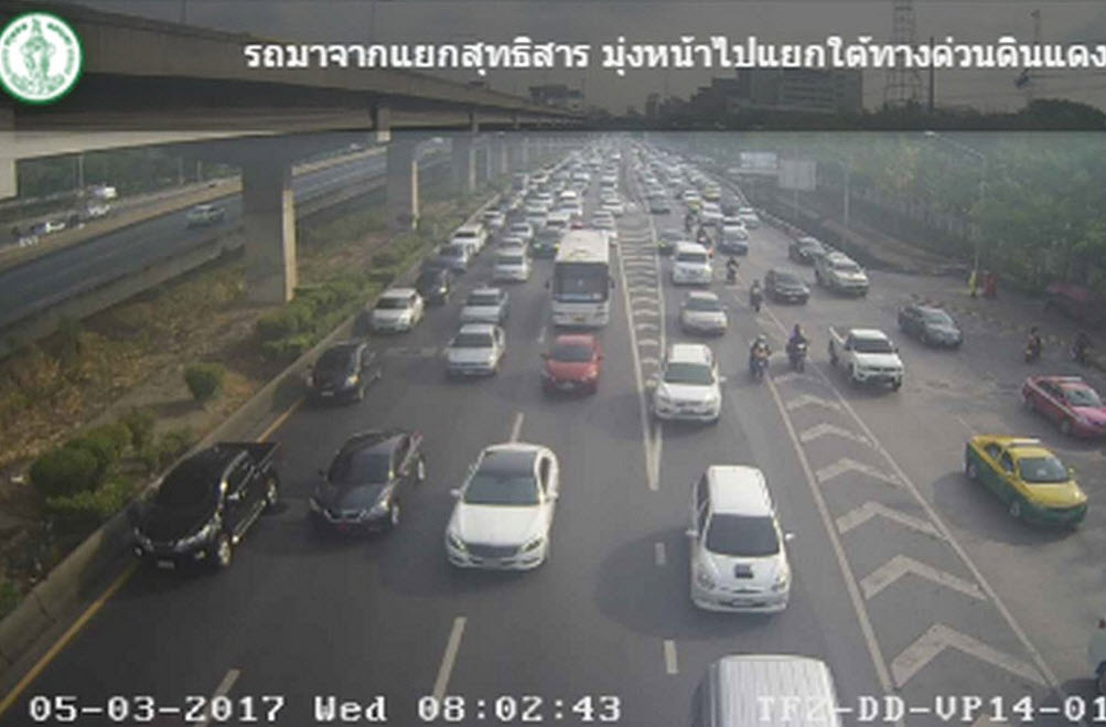 ถนนวิภาวดี-รังสิต ขาเข้า จากแยกสุทธิสาร มุ่งหน้าใต้ด่วนดินแดง รถมาก เคลื่อนตัวช้า ท้ายสะสมสะพานข้ามคลองบางซื่อ
