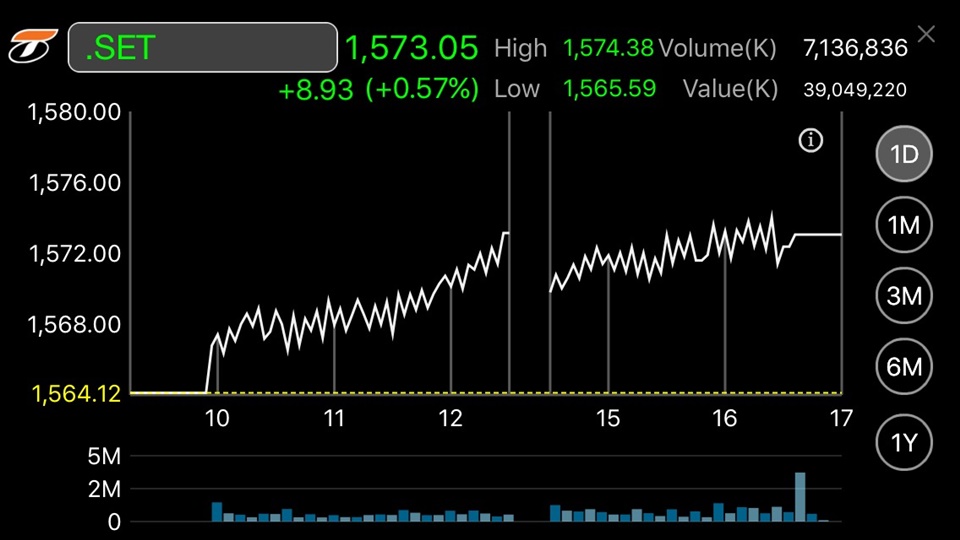 ผู้สื่อข่าวรายงานว่าดัชนีตลาดหลักทรัพย์ฯ ปิดการซื้อขายวันนี้ที่ระดับ 1,573.05 จุด เพิ่มขึ้น 8.93 จุด หรือร้อยละ 0.57 มูลค่าการซื้อขายรวม 39,049.22 ล้านบาท โดยดัชนีตลอดทั้งวันอยู่ในแดนบวก ปรับตัวสูงสุดที่ระดับ 1,574.38 จุด และต่ำสุดที่ระดับ 1,565.59 จุด