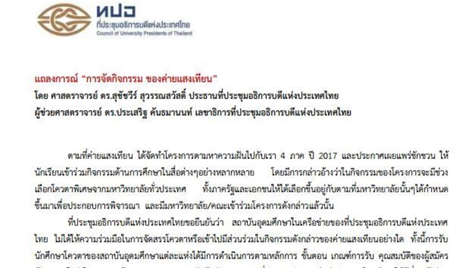 นายสุชัชวีร์ สุวรรณสวัสดิ์ อธิการบดีสถาบันเทคโนโลยีพระจอมเกล้าเจ้าคุณทหารลาดกระบัง ในฐานะประธานที่ประชุมอธิการบดีแห่งประเทศไทย (ทปอ.) เปิดเผยว่า เบื้องต้นได้สอบถามอธิการบดีมหาวิทยาลัยหลายแห่ง ทุกแห่งไม่เคยทราบเรื่องนี้และไม่ได้เข้าโครงการนี้ ดังนั้น ทปอ.จึงได้ออกแถลงการณ์เกี่ยวกับกรณีดังกล่าว ว่า ตามที่ค่ายแสงเทียน ได้จัดทำโครงการตามหาความฝันไปกับเรา 4 ภาคปี 2017 และประกาศเผยแพร่ชักชวนให้นักเรียนเข้าร่วมกิจกรรมด้านการศึกษาในสื่อต่างๆอย่างหลากหลาย โดยมีการกล่าวอ้างว่าในกิจกรรมของโครงการจะมีช่วงเลือกโควตาพิเศษจากมหาวิทยาลัยทั่วประเทศ ทั้งภาครัฐและเอกชนให้ได้เลือกขึ้นอยู่กับตามที่มหาวิทยาลัยนั้นๆ ได้กำหนดขึ้นมาเพื่อประกอบการพิจารณา และมีมหาวิทยาลัย/คณะเข้าร่วมโครงการดังกล่าวแล้วนั้น