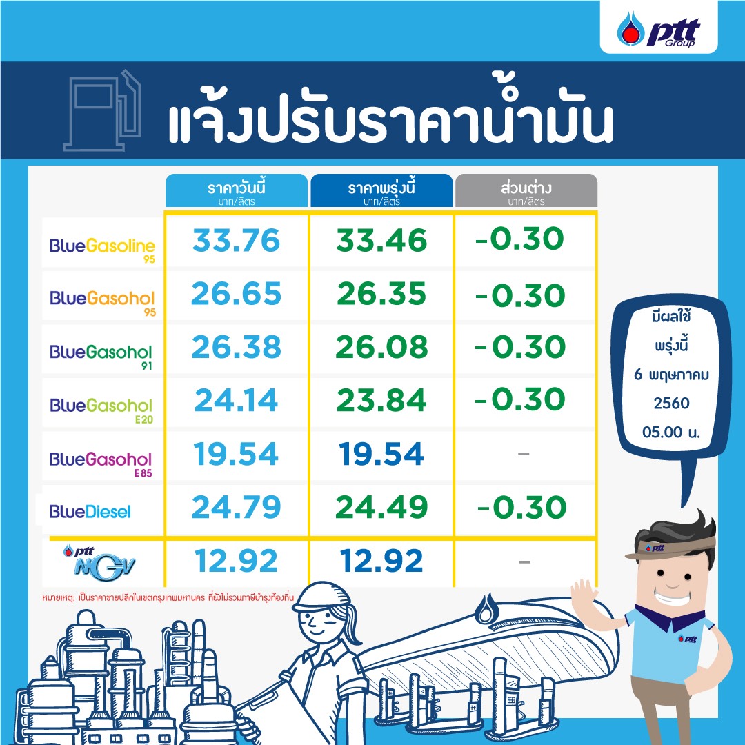 นายสุชาติ ระมาศ ผู้ช่วยกรรมการผู้จัดการใหญ่การตลาดขายปลีก บมจ.ปตท. กล่าวว่า การปรับลดราคาน้ำมันพรุ่งนี้ 30 สตางค์ ต่อลิตร เป็นไปตามทิศทางราคาน้ำมันตลาดโลกที่ลดลง โดยในช่วง 2 สัปดาห์ที่ผ่ามา ราคาน้ำมันในประเทศไทยปรับลดรวม 4 ครั้ง กลุ่มเบนซิน ลดลดรวม 1.30 บาท/ลิตร ดีเซลลดลง 1.40 บาท/ลิตร ส่วนอี 85 ลดลงเพียงครั้งเดียว 20 สตางค์/ลิตร เนื่องจากอี 85 ราคาต้นทุนหลักมาจากเอทานอล ที่ราคาไม่ได้เปลี่ยนแปลงตามราคาน้ำมันดิบ