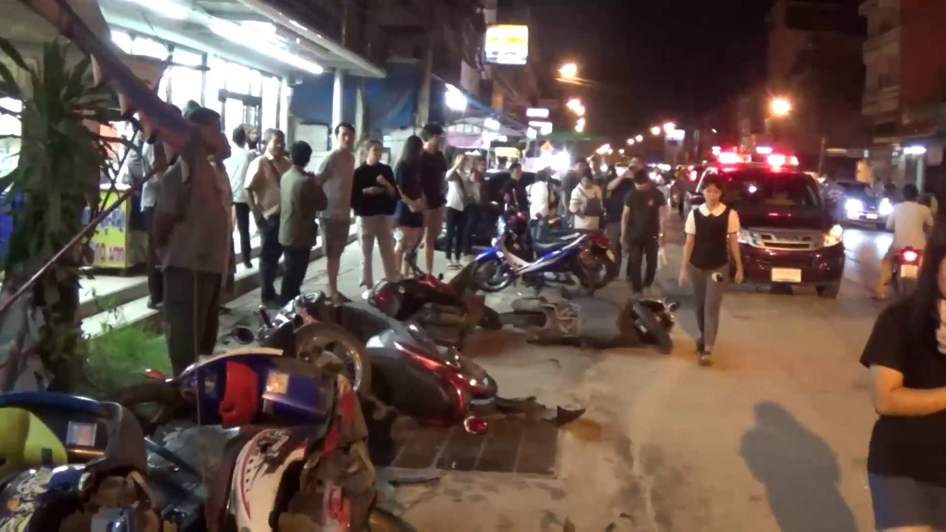 ส่วนรถกระบะคันก่อเหตุอยู่ในสภาพขวางถนน ห่างไปประมาณ50เมตร ด้านหน้ารถเสียหาย ไม่สามารถขับเคลื่อนได้ ขณะที่คนขับเป็นชาย อายุ 28 ปี มีอาการมึนเมาอย่างหนักและไม่ได้รับบาดเจ็บ เจ้าหน้าที่ได้คุมตัวไปตรวจวัดแอลกอฮอล์ และสอบปากคำเบื้องต้นทราบว่าเพิ่งกลับจากดื่มสังสรรค์กับเพื่อนในย่านดังกล่าว โดยขับมาด้วยความเร็วสูงจนรถเสียการทรงตัว และพุ่งชนร้านค้าไปตลอดแนว.-สำนักข่าวไทย