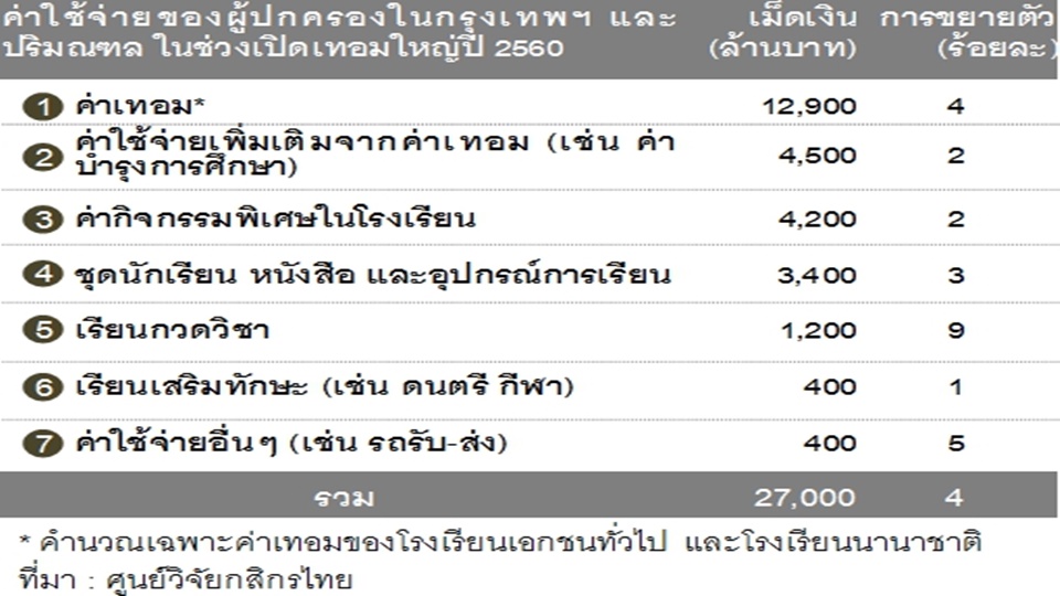 ศูนย์วิจัยกสิกรไทย คาดว่า ช่วงเปิดเทอมใหญ่ปี 2560 ผู้ปกครองในกรุงเทพฯ และปริมณฑล น่าจะใช้จ่ายด้านการศึกษาสำหรับบุตรหลานคิดเป็นเม็ดเงินสะพัด 27,000 ล้านบาท ขยายตัวร้อยละ 4 เมื่อเทียบกับในช่วงเปิดเทอมใหญ่ปี 2559 โดยการใช้จ่ายด้านค่าเทอม และค่าเรียนกวดวิชา หนุนให้เม็ดเงินค่าใช้จ่ายด้านการศึกษาโดยรวมยังสามารถขยายตัว เมื่อเทียบกับในช่วงเปิดเทอมใหญ่ปี 2559.-สำนักข่าวไทย