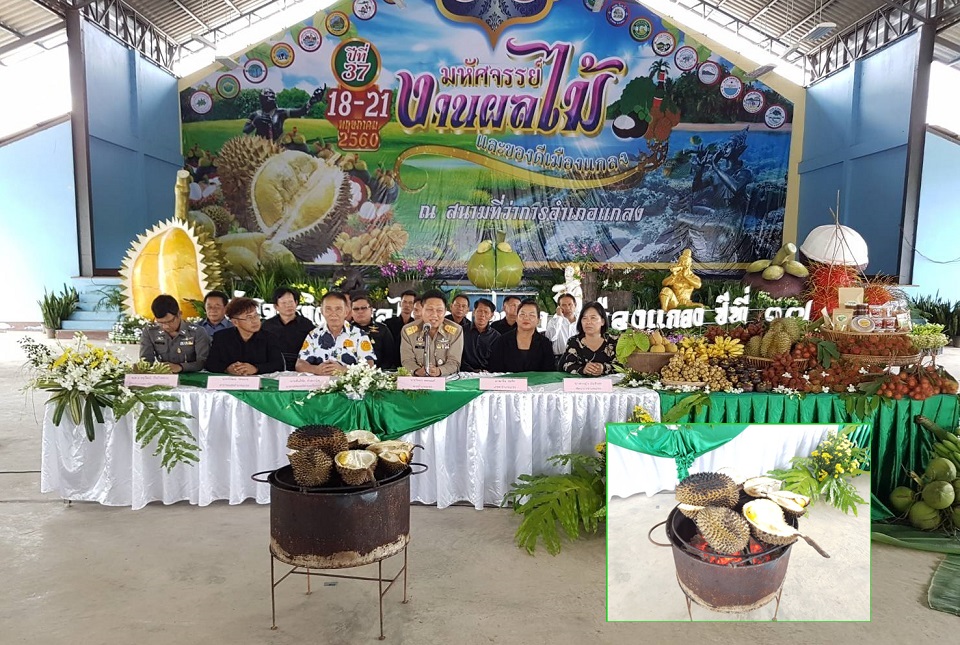 นายอำเภอแกลง ย้ำว่า เฉพาะวันที่ 20 – 21 พฤษภาคม เปิดให้ชิมผลไม้ฟรีและทุเรียนเผา ซึ่งทำขึ้นเป็นแห่งแรกของจังหวัดระยอง โดยนำทุเรียนพันธุ์หมอนทองและชะนีที่แก่จัด แต่ยังไม่สุก นำมาใส่เตาเผาจนเปลือกแตกออก แสดงว่าสุก นำมากินมีรสชาติหอม รสกลมกล่อมกลิ่นไม่แรง หวานกำลังดี.-สำนักข่าวไทย