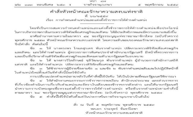 ผู้สื่อข่าวรายงานว่า วันนี้(5 พ.ย.) ราชกิจจานุเบกษาเผยแพร่คำสั่งหัวหน้าคณะรักษาความสงบแห่งชาติ ที่ 66/2559 เรื่อง การกำหนดตำแหน่งและแต่งตั้งข้าราชการให้ดำรงตำแหน่ง โดยที่เป็นการสมควรกำหนดตำแหน่งและแต่งตั้งข้าราชการให้ดำรงตำแหน่งเพื่อประโยชน์ในการบริหารราชการในกระทรวงดิจิทัลเพื่อเศรษฐกิจและสังคม ให้มีประสิทธิภาพและมีความเหมาะสมยิ่งขึ้น อาศัยอำนาจตามความในมาตรา 44 ของรัฐธรรมนูญแห่งราชอาณาจักรไทย (ฉบับชั่วคราว) พุทธศักราช 2557 จึงมีคำสั่งให้ นางทรงพร โกมลสุรเดช พ้นจากตำแหน่ง ปลัดกระทรวงดิจิทัลเพื่อเศรษฐกิจและสังคม และให้ดำรงตำแหน่งผู้ตรวจราชการพิเศษประจำสำนักนายกรัฐมนตรี มีหน้าที่ตรวจราชการและเป็นที่ปรึกษาด้านดิจิทัลเพื่อเศรษฐกิจและสังคมตามที่นายกรัฐมนตรีมอบหมาย และให้น.ส.วิไลลักษณ์ ชุลีวัฒนกุล พ้นจากตำแหน่งผู้อำนวยการสำนักงานสถิติแห่งชาติ และให้ดำรงตำแหน่ง ปลัดกระทรวงดิจิทัลเพื่อเศรษฐกิจและสังคม
