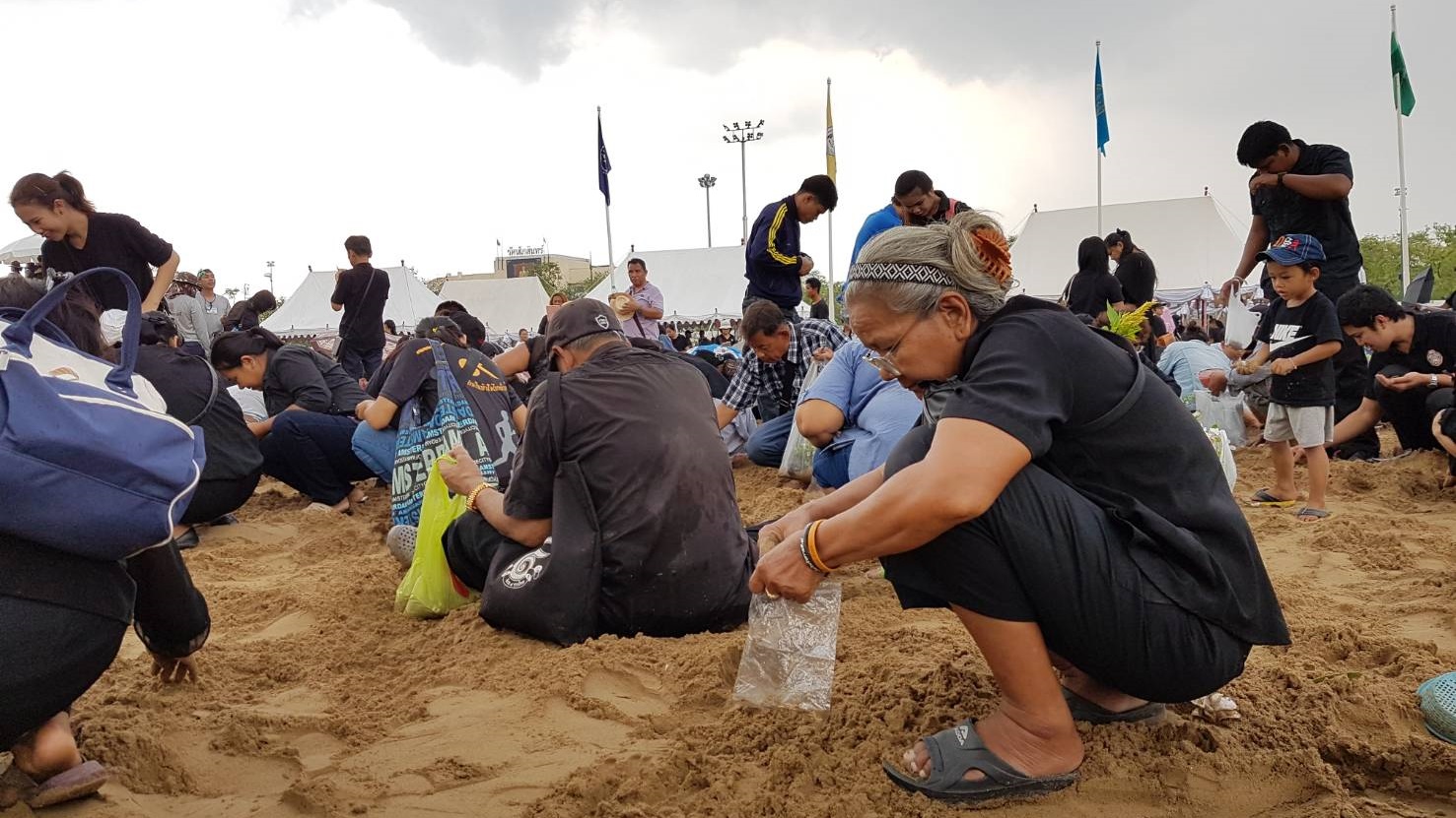 ที่มณฑลพิธีท้องสนามหลวง บรรยากาศพี่น้องประชาชนและเกษตรกรต่างกรูเข้าเก็บเมล็ดพันธุ์ข้าว-พันธุ์พืชที่พระยาแรกนาโปรยหว่านในพระราชพิธี หลังจากงานพระราชพิธีเสร็จสิ้นท่ามกลางฝนที่ตกลงมาอย่างหนัก แต่ยังคงมีประชาชนบางส่วนปักหลักกางร่มเก็บเมล็ดพันธุ์