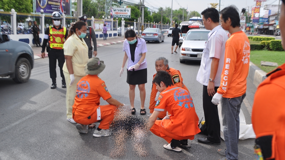 ด้านนายฤทธิ์ณรงค์ จอแอ อาชีพขับรถจักรยานยนต์รับจ้าง ผู้เห็นเหตุการณ์ เล่าว่า ก่อนเกิดเหตุเห็นผู้ตายนั่งอยู่ริมถนน ไม่นานก็เดินผ่านหน้าคิว จยย.ไปขึ้นสะพานลอย ตนคิดว่าผู้ตายคงจะไปหาหมอซึ่งอยู่ฝั่งตรงข้าม สักพักมองไปบนสะพานเห็นคล้ายมีของตกลงมากลางถนน แต่ไม่คิดว่าจะเป็นคน จากนั้นได้ยินคนตะโกนร้องว่ามีคนถูกรถทับ ตนจึงวิ่งข้ามไปยังเกาะกลางถนน พบว่าเป็นผู้หญิงคนที่เดินผ่านหน้าคิว จยย.ไปขึ้นสะพานลอยนั่นเอง