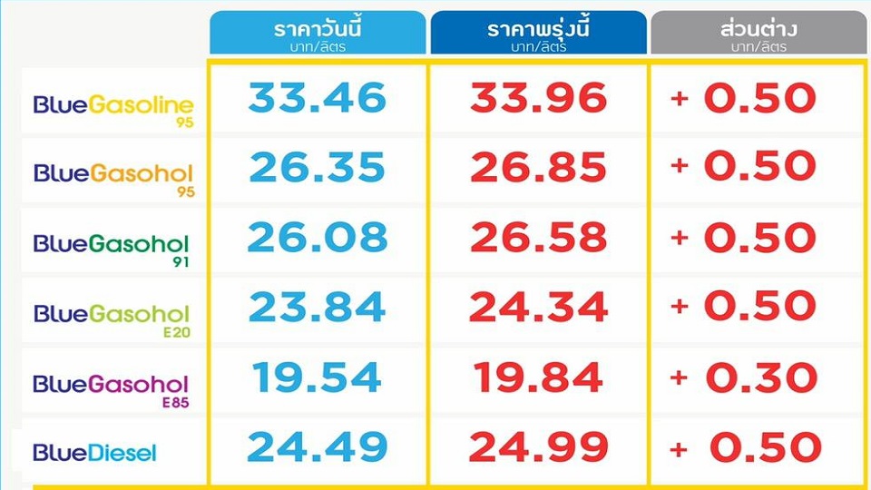 เพิ่มขึ้น 0.50 บาทต่อลิตร โดยราคาขายปลีก