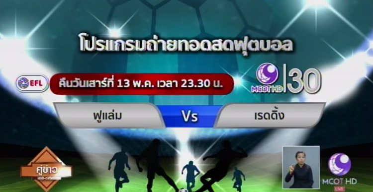 สำนักข่าวไทย 13 พ.ค.-แฟนฟุตบอลอังกฤษ ห้ามพลาด ศึก EFL แชมเปี้ยนชิพ ก้าวเข้าสู่รอบเพลย์ออฟแล้ว โดย ช่อง 9 MCOT HD หมายเลข 30 ประเดิมถ่ายทอดสดนัดแรก ฟูแล่ม เปิดบ้านพบ เรดดิ้ง