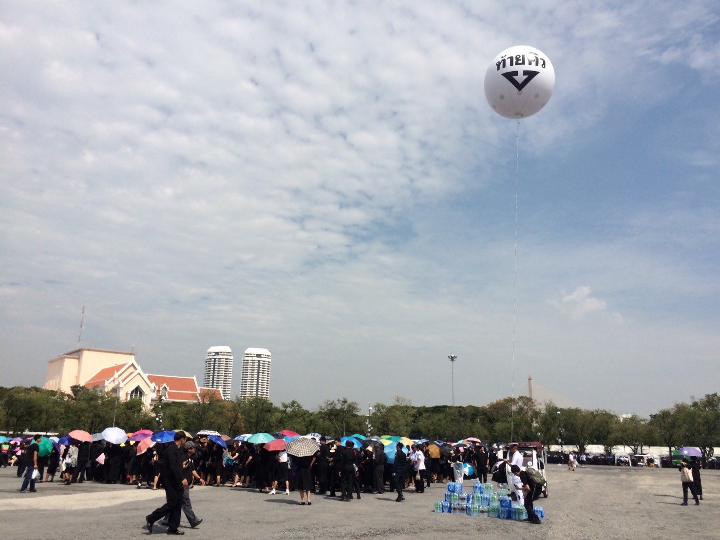 เข้าสู่วันที่ 8 ( 5 พ.ย.) ที่สำนักพระราชวังเปิดให้ประชาชนเข้ากราบถวายสักการะเบื้องหน้าพระโกศพระบรมศพพระบาทสมเด็จพระปรมินทรมหาภูมิพลอดุลยเดช ณ พระที่นั่งดุสิตมหาปราสาท วันนี้ มีประชาชนหลั่งไหลมาจากทั่วทุกสารทิศมากกว่าทุกวัน เนื่องจากเป็นวันหยุด ทำให้ ท้ายแถวที่ประชาชนรอขึ้นกราบสักการะพระบรมศพ บนพระที่นั่งดุสิตมหาปราสาท ม้วนเข้าไปอยู่ในสนามหลวงฝั่งมหาวิทยาลัยธรรมศาสตร์ โดยมีการติดตั้งบอลลูนที่มีคำว่า “ท้ายคิว” เคลื่อนตามหางแถวไปเรื่อยๆ เพื่อเป็นจุดสังเกตให้กับประชาชน เนื่องจากมีประชาชนเดินทางมาจำนวนมากทำให้ต้องเวลาในการรอคิวนานกว่า 6 ชั่วโมงแล้ว อย่างคุณยายอุไร อินทวงศ์ วัย 75 ปี เดินทางมาจากจ.ภูเก็ต รอเข้าคิวตั้งแต่ 04.30 น. แม้สภาพร่างกายจะไม่เอื้ออำนวยแต่ก็ตั้งใจเข้าไปกราบถวายสักการะพระบรมศพเป็นครั้งสุดท้าย