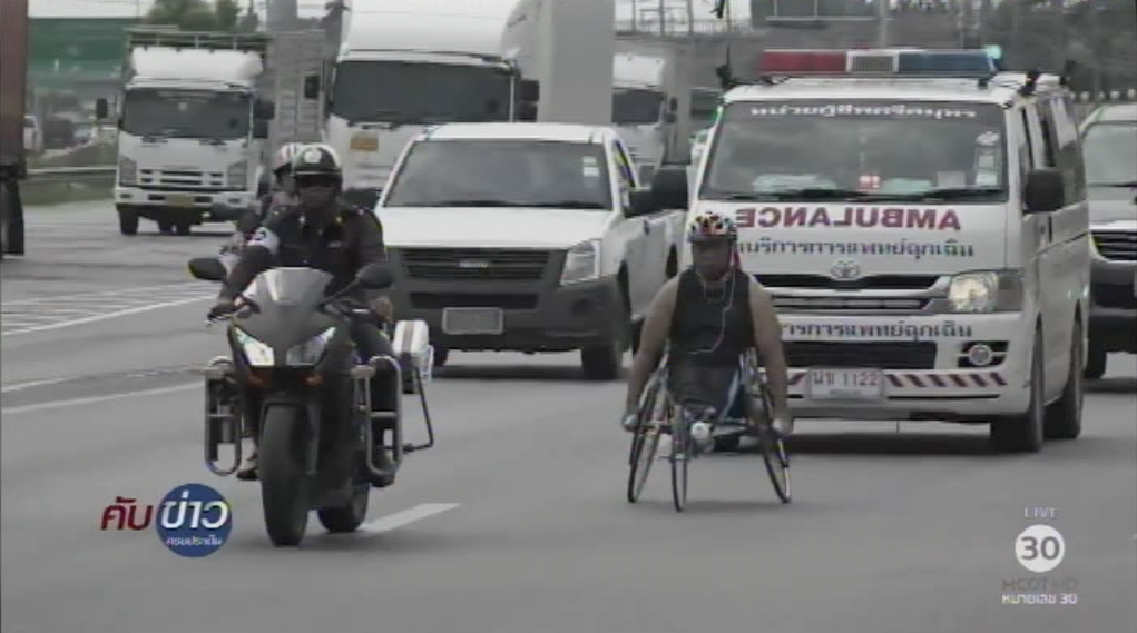 สมุทรสาคร 4 พ.ย.-หนุ่มนักกีฬาพิการวัย 40 ปี ปั่นวีลแชร์มาจาก จ.ระนอง ตั้งแต่วันที่ 1 พ.ย. เพื่อไปถวายสักการะพระบรมศพ ระยะทางรวมกว่า 600 กม. ล่าสุดถึง จ.สมุทรสาครแล้ว