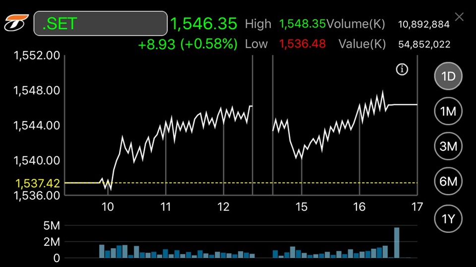 ผู้สื่อข่าวรายงานว่าวันนี้ (16 พ.ค.) ดัชนีตลาดหลักทรัพย์ปิดที่ระดับ 1,546.35 จุด เพิ่มขึ้น 8.93 จุด มูลค่าการซื้อขาย 54,852.02 ล้านบาท โดยดัชนีเคลื่อนไหวแดนบวกส่วนใหญ่ แตะจุดสูงสุดที่ระดับ 1,548.35 จุด และต่ำสุดที่ระดับ 1,536.48 จุด