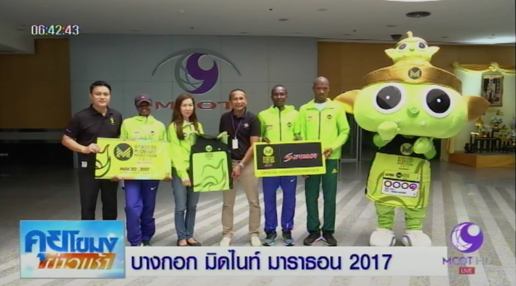 คุณณัฐิสิริ ชลธิสิริศิลป์ ผจก.ฝ่ายการตลาดเครื่องดื่มเกลือแร่สปอนเซอร์ นำนักวิ่งอีลิทสมาชิก IAAF หรือสหพันธ์กรีฑานานาชาติ จากเคนยาและแอฟริกาใต้ เดินทางมาที่ บมจ.อสมท เพื่อประชาสัมพันธ์การแข่งขันวิ่งฟูลมาราธอนกลางคืนมาตรฐานระดับโลกครั้งแรกในไทย “บางกอก มิดไนท์ มาราธอน 2017 พรีเซ็นเต็ดบาย เครื่องดื่มเกลือแร่สปอนเซอร์” ชิงเงินรางวัลรวมกว่า 2 ล้านบาท มีนักวิ่งน่องเหล็กชั้นนำจาก 30 ชาติ และหน้าใหม่เข้าร่วมนับหมื่นคน โดยจะออกสตาร์ทบนสะพานพระราม 8 ในวันที่ 20 พ.ค.นี้ ในเวลา 23.59 น. สำหรับรายการนี้มีผ่านการรับรองจากสหพันธ์กรีฑาแห่งเอเซีย (AAA) และสมาคมกีฬากรีฑาแห่งประเทศไทย