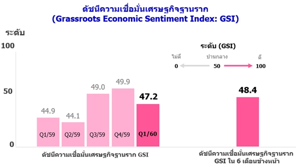 นายชาติชาย พยุหนาวีชัย ผู้อำนวยการธนาคารออมสิน เปิดเผยว่า ผลการสำรวจดัชนีความเชื่อมั่นเศรษฐกิจฐานราก (GSI) ไตรมาส 1 ปี 2560 สำรวจจากกลุ่มตัวอย่างประชาชนที่มีรายได้ไม่เกิน 15,000 บาท ทั่วประเทศ 1,843 ตัวอย่าง พบว่า ดัชนี GSI ไตรมาส 1 ปี 2560 อยู่ที่ระดับ 47.2 ปรับลดลงจากไตรมาส 4 ปี 2559 ที่อยู่ระดับ 49.9 เนื่องจากประชาชนระดับฐานรากรู้สึกว่าภาวะเศรษฐกิจภาพรวมของประเทศไทยในปัจจุบันยังฟื้นตัวค่อนข้างล่าช้า ราคาสินค้าและค่าครองชีพสูง ประกอบกับโอกาสการหางานทำยังทรงตัวอยู่ในระดับต่ำ