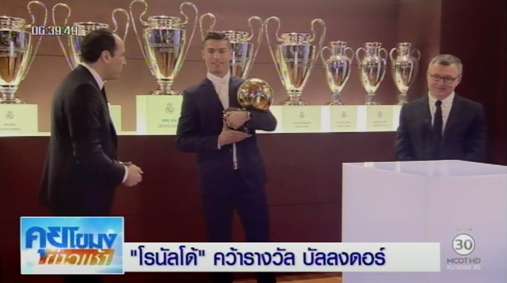 คริสเตียโน โรนัลโด นักเตะวัย 31 ปี ของสโมสรรีล มาดริด ทีมดังในศึกลา ลีกา สเปน คว้ารางวัล “บัลลงดอร์” หรือ นักเตะยอดเยี่ยมของโลกจากของนิตสาร “ฟรองซ์ ฟุตบอล” ประเทศฝรั่งเศส ไปครองเป็นสมัยที่ 4 จากการประกาศผลรางวัลเมื่อคืนที่ผ่านมา สำหรับโรนัลโด มีผลงานในการช่วยให้ทีมเรอัล มาดริด คว้าแชมป์ยูฟ่า แชมเปียนส์ ลีก ในฤดูกาลที่ผ่านมา และยังช่วยให้ทีมชาติโปรตุเกสคว้าแชมป์ฟุตบอลยูโร 2016 ส่งผลให้โรนัลโดได้รับคะแนนเสียงสูงสุดจากการโหวตของคณะกรรมการ ซึ่งเป็นสื่อมวลชน 173 คนจากทั่วโลก ซึ่งเอาชนะ ลีโอเนล เมสซี ทีมชาติอาร์เจนตินา ของสโมสรบาร์เซโลนา ที่คว้ารางวัลนี้ 5 สมัย และอองตวน กรีซมันน์ กองหน้าฝรั่งเศส จากสโมสรแอตเลติโก มาดริด