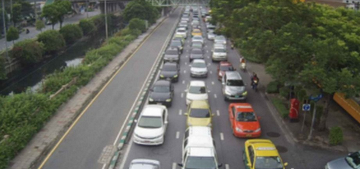 ถนนสาทร จากแยกสุรศักดิ์ มุ่งหน้า โรงเรียนกรุงเทพคริสเตียน รถเคลื่อนตัวได้ตามจังหวะสัญญาณไฟ
