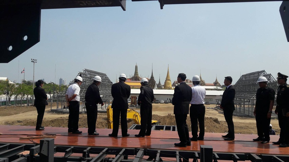 สัปดาห์ที่ผ่านมา เจ้าหน้าที่ทยอยรื้อถอนอาคารนิทรรศการเย็นศิระเพราะพระบริบาล ให้แล้วเสร็จภายในเดือนมิถุนายน เพื่อตัดถนนใหม่ตรงกลางสนามหลวง เพื่อรองรับริ้วขบวนพระราชอิสริยยศ อัญเชิญพระโกศพระบรมศพพระบาทสมเด็จพระปรมินทรมหาภูมิพลอดุลยเดช เข้าสู่มณฑลพิธี ส่วนงานประติมากรรมต่างๆ บางส่วนเริ่มทาสีรองพื้นและทดสอบสีอยู่ในโรงเขียนสี ซึ่งไม่มีปัญหาเรื่องฝน ทุกส่วนงานมีความคืบหน้าตามลำดับ.-สำนักข่าวไทย