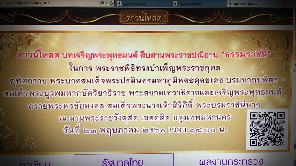 เวบไซด์ กรมประชาสัมพันธ์ www.prd.go.th เปิดให้ดาวน์โหลดบทเจริญพระพุทธมนต์ สืบสานพระราชปณิธาน ‘ธรรมราชินี’ ในการพระราชพิธีทรงบำเพ็ญพระราชกุศลอุทิศถวายพระบาทสมเด็จพระปรมินทรมหาภูมิพลอดุลยเดช บรมนาถบพิตร สมเด็จพระบูรพมหากษัตริยาธิราช พระสยามเทวาธิราช และเจริญพระพุทธมนต์ ถวายพระพรชัยมงคล สมเด็จพระนางเจ้าสิริกิติ์ พระบรมราชินีนาถ ณ ลานพระราชวังดุสิต เขตดุสิต กรุงเทพมหานคร วันที่ 23 พฤษภาคม 2560 เวลา 18.00 น.