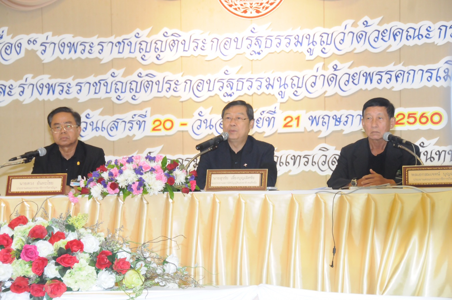 นายสุรชัย เลี้ยงบุญเลิศชัย รองประธานสภานิติบัญญัติแห่งชาติ (สนช.) ในฐานะประธานคณะกรรมาธิการสามัญพิจารณาศึกษา เสนอแนะ และรวบรวมเพื่อประกบอการพิจารณาจัดทำร่างรัฐธรรมนูญ สนช. พร้อมด้วย พล.อ.สมเจตน์ บุญถนอม ประธานกรรมาธิการวิสามัญพิจารณาร่างพระราชบัญญัติประกอบรัฐธรรมนูญว่าด้วยพรรคการเมือง และนายตวง อันทะไชย ประธานกรรมาธิการวิสามัญพิจารณาร่างพระราชบัญญัติประกอบรัฐธรรมนูญว่าด้วยเรื่องคณะกรรมการการเลือกตั้ง แถลงภาพรวมโครงการจัดสัมมนาเรื่องร่างพระราชบัญญัติประกอบรัฐธรรมนูญว่าด้วยคณะกรรมการการเลือกตั้ง (กกต.) และร่างพระราชบัญญัติประกอบรัฐธรรมนูญว่าด้วยพรรคการเมือง ที่โรงแรมนิวแทรเวล ลอด์จ จังหวัดจันทบุรี โดยพลเอกสมเจตน์ กล่าวว่า ร่างพระราชบัญญัติประกอบรัฐธรรมนูญว่าด้วยพรรคการเมือง ยังมีประเด็นที่ค้างการพิจารณาอยู่ 3 ประเด็น ได้แก่ การจ่ายทุนประเดิมจัดตั้งพรรคการเมือง 1 ล้านบาท โดยสมาชิก สนช. เห็นตรงกันว่าจะต้องมีการจ่ายเงินในส่วนนี้ แต่ควรอนุโลมจัดเก็บหลังการจัดตั้งพรรคการเมือง แต่ในระหว่างนี้พรรคการเมือง จะยังไม่สามารถส่งผู้สมัครเลือกตั้งได้ ขณะที่ การจ่ายเงินบำรุงค่าสมาชิกพรรครายปี สมาชิก สนช. ยังมีความเห็นที่หลากหลาย แต่เบื้องต้น หากมีความจำเป็นต้องจัดเก็บ อาจขอความร่วมมือกับธนาคารเพื่อการเกษตร และสหกรร์การเกษตร (ธกส.)และบริษัทไปรษณีย์ไทย ช่วยพรรคการเมืองจัดเก็บเงิน และสุดท้าย คือ การมีส่วนร่วมของสมาชิกพรรคการเมือง เช่น การให้สมาชิกพรรคการเมือง มีส่วนในการคัดเลือกสมาชิกลงสมัคร ส.ส.แบบแบ่งเขต และบัญชีรายชื่อ ที่ยังไม่ได้ข้อสรุป