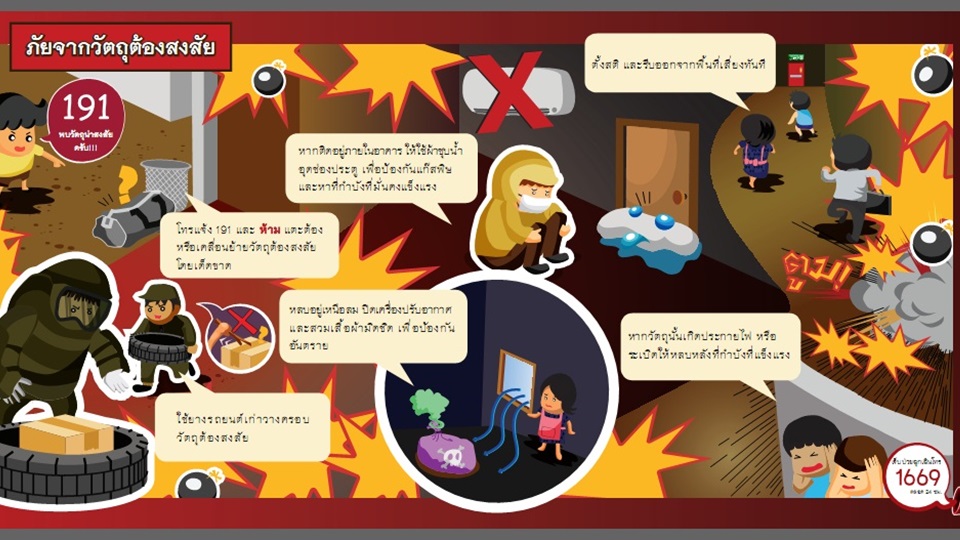 1. หากพบวัตถุต้องสงสัยให้รีบโทรแจ้ง 191ทั้งนี้ ห้ามแตะต้องหรือเคลื่อนย้ายวัตถุต้องสงสัยโดยเด็ดขาด