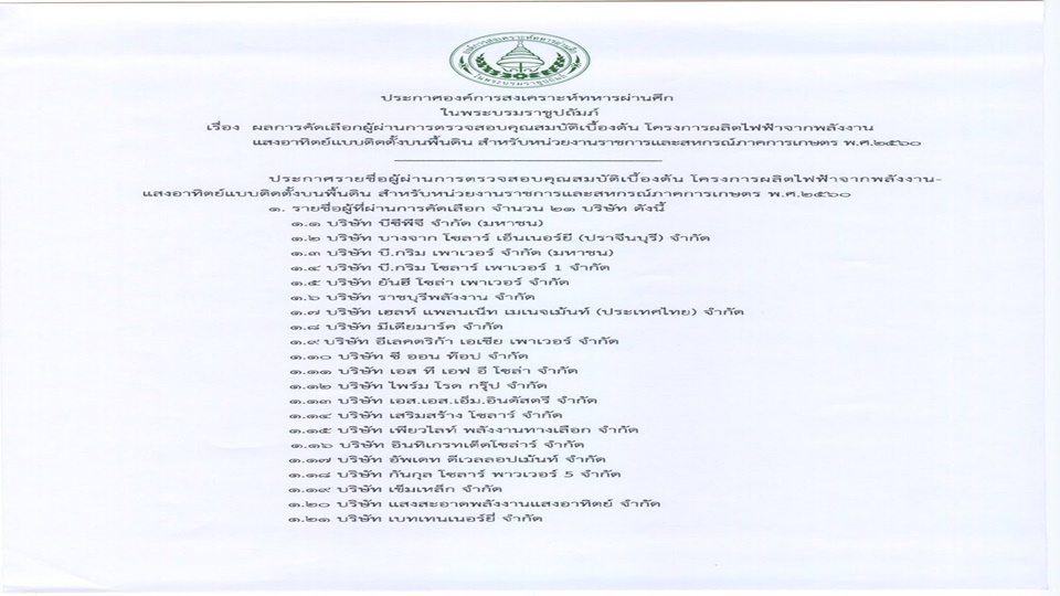 ด้าน อผศ.ประกาศเรื่องผลการคัดเลือกผู้ผ่านการตรวจสอบคุณสมบัติเบื้องต้นผ่านการคัดเลือกที่จะร่วมดำเนินการด้วย 21 บริษัท สามารถเสนอโครงการได้โครงการละ 5 เมกะวัตต์ รวมไม่เกิน 5 โครงการ ประกอบด้วย บมจ.บีซีพีจี (BCPG) ,บริษัท บางจาก โซลาร์ เอ็นเนอร์ยี่ (ปราจีนบุรี) จำกัด ในกลุ่ม BCPG ,บมจ.บี.กริม.เพาเวอร์ , บริษัท บี.กริม โซลาร์ เพาเวอร์ 1 จำกัด ,บริษัท ยันฮี โซล่า เพาเวอร์ จำกัด ,บริษัท ราชบุรีพลังงาน จำกัด ในกลุ่มบมจ.ผลิตไฟฟ้าราชบุรีโฮลดิ้งส์ (RATCH) ,บริษัท เฮลท์ แพลนเน็ท เมเนจเม้นท์ (ประเทศไทย) จำกัด ในกลุ่มบมจ.ซุปเปอร์บล๊อก (SUPER) , บริษัท มีเดียมาร์ค จำกัด ในกลุ่ม SUPER , บริษัท อีเลคตริก้า เอเชีย เพาเวอร์ จำกัด ในกลุ่ม SUPER ,บริษัท ซี ออน ท๊อป จำกัด , บริษัท เอส ที เอฟ อี โซล่า จำกัด ในกลุ่ม SUPER ,บริษัท ไพร์ม โรด กรุ๊ป จำกัด