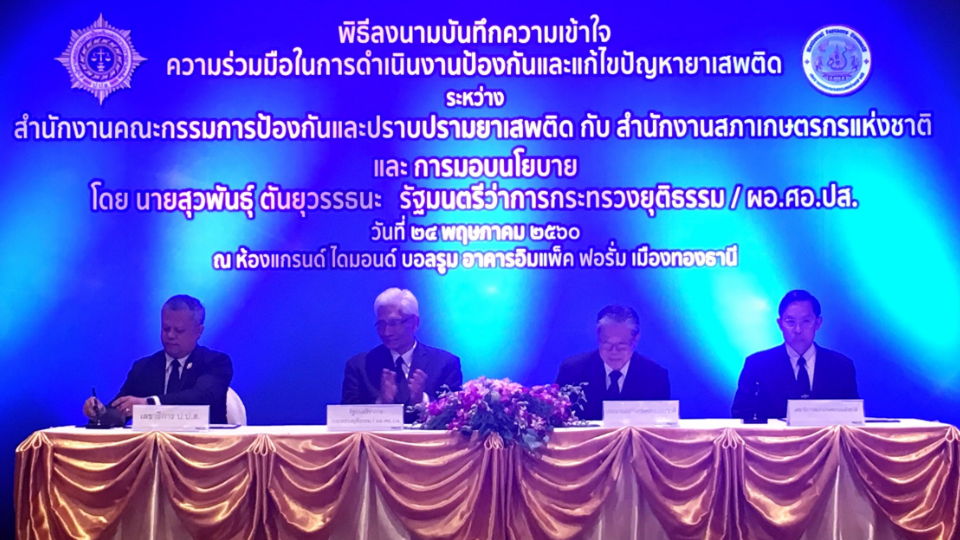 จ.นนทบุรี 24 พ.ค.-กระทรวงยุติธรรมจับมือสภาเกษตรกรแห่งชาติ ใช้เครือข่ายเกษตรกรทั่วประเทศ ร่วมป้องกัน แก้ไขปัญหายายาเสพติด