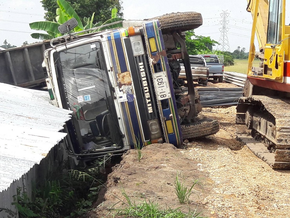ปทุมธานี 24 พ.ค.- คนงานก่อสร้างเขื่อนริมคลองเมืองปทุมฯ พักเที่ยงนั่งกินข้าวในบ้าน เกิดเหตุไม่คาดคิด รถสิบล้อบรรทุกเหล็กเส้นพลิกทับดับ 3 เจ็บ 2 คาดสาเหตุดินอ่อนตัว