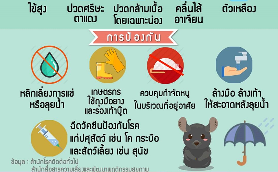 เนื่องจากโรคฉี่หนู เกิดจากการสัมผัสปัสสาวะของสัตว์โดยตรง หรือติดต่อโดยทางอ้อมจากแหล่งน้ำ ทุ่งนา และบริเวณที่มีน้ำขัง ผู้ป่วยที่ติดเชื้อจะมีอาการไข้สูง ปวดศีรษะ ปวดเมื่อยกล้ามเนื้อน่อง ตาแดง หากผู้ใดพบว่ามีอาการดังกล่าว ให้รีบไปพบแพทย์เพื่อตรวจรักษาทันที เพราะหากล่าช้า อาจมีอาการไข้รุนแรงถึงขั้นไตวายเสียชีวิตได้