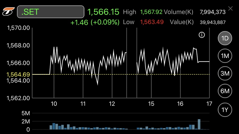 ผู้สื่อข่าวรายงานว่าดัชนีตลาดหลักทรัพย์ปิดตลาดวันนี้ที่ระดับ 1,566.15 จุด เพิ่มขึ้น 1.46 จุด หรือร้อยละ 0.09 มูลค่าการซื้อขาย 38,881.24 ล้านบาท โดยดัชนีหุ้นไทยเคลื่อนไหวแดนบวก แตะจุดสูงสุดที่ 1,567.92 จุด และแตะจุดต่ำสุดที่ระดับ 1,563.49 จุด