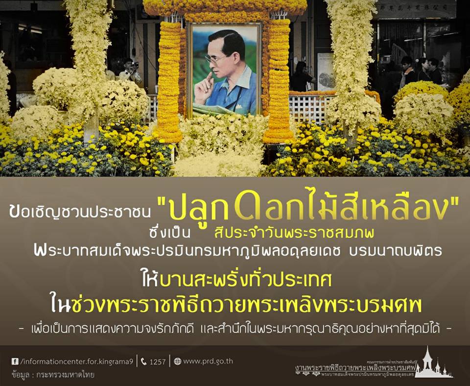 กระทรวงมหาดไทย เชิญชวนภาคราชการ ภาคเอกชน และประชาชนทั่วประเทศ ปลูกดอกดาวเรือง หรือดอกไม้สีเหลือง ซึ่งเป็นสีประจำวันพระราชสมภพพระบาทสมเด็จพระปรมินทรมหาภูมิพลอดุลยเดช ประดับสถานที่ราชการ สถานที่สำคัญของจังหวัด บริษัท ห้างร้าน และบ้านเรือนประชาชน ให้ออกดอกและบานสะพรั่งในช่วงพระราชพิธีถวายพระเพลิงพระบรมศพพระบาทสมเด็จพระปรมินทรมหาภูมิพลอดุลยเดช ตั้งแต่วันที่ ๒๐ ตุลาคม ๒๕๖๐ เป็นต้นไป เพื่อเป็นการแสดงความจงรักภักดี และสำนึกในพระมหากรุณาธิคุณอย่างหาที่สุดมิได้. -สำนักข่าวไทย
