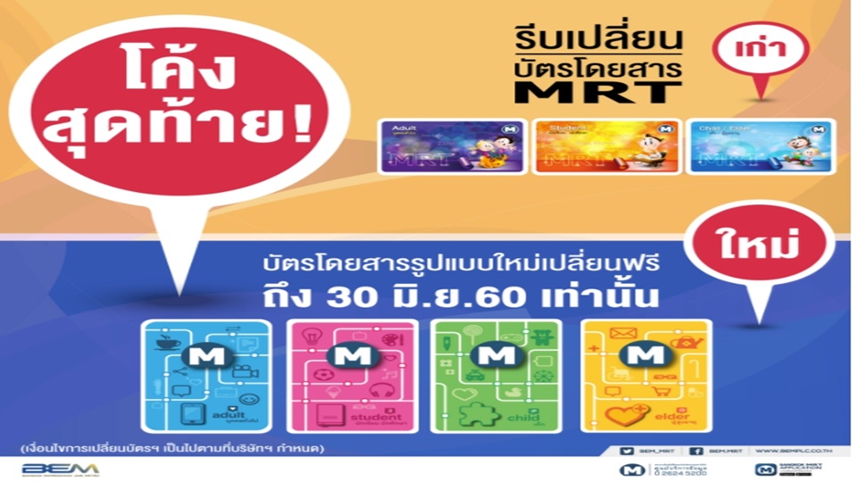 บริษัท ทางด่วนและรถไฟฟ้ากรุงเทพ จำกัด (มหาชน) หรือ BEM ขอแจ้งผู้โดยสาร MRT ที่ใช้บัตรโดยสารชนิดเติมเงินรูปแบบเก่าทุกประเภทมาเปลี่ยนเป็นบัตรโดยสารรูปแบบใหม่ โดยมอบสิทธิพิเศษฟรีค่าธรรมเนียมการออกบัตรให้ทันทีและโอนค่ามัดจำบัตรและมูลค่าคงเหลือในบัตรฯ ตั้งแต่วันนี้จนถึง 30 มิถุนายน 2560 เท่านั้น .-สำนักข่าวไทย