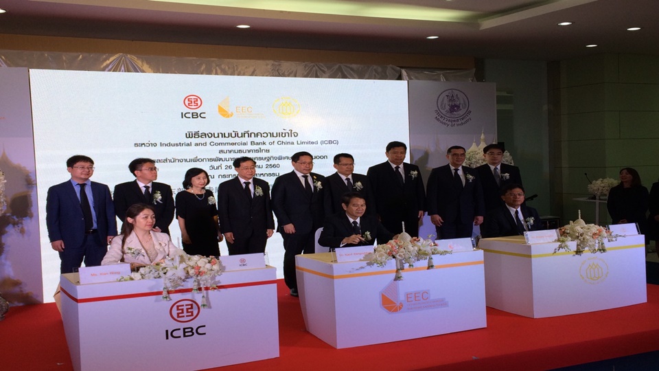 นายอุตตม สาวนายน รัฐมนตรีว่าการกระทรวงอุตสาหกรรม เป็นประธานลงนามร่วมกันระหว่างสำนักงานเพื่อการพัฒนาระเบียงเศรษฐกิจพิเศษภาคตะวันออก (สกรศ.) ธนาคาร Industrial and Commercial Bank of China Limited (ไอซีบีซี) สาธารณรัฐประชาชนจีน และสมาคมธนาคารไทย เพื่อลงนามในบันทึกความเข้าใจ (เอ็มโอยู) เพื่อเสริมสร้างความสัมพันธ์และเตรียมวางแผนความร่วมมือด้านการลงทุนในพื้นที่ระเบียงเศรษฐกิจพิเศษภาคตะวันออก (อีอีซี) นับเป็นการลงนามของอีอีซีกับสถาบันการเงินนำร่องรายแรกด้านการเงิน เนื่องจากไอซีบีซีมีสาขา 143 ประเทศทั่วโลก เป็นแบงก์ใหญ่ที่สุดในโลกและมีเครือข่ายครอบคลุม เพื่อนำนักลงทุนต่างชาติเข้ามาลงทุนในอีอีซี โดยเฉพาะนักลงทุนจีนพร้อมเข้ามาลงทุน 30 ราย จากผู้ลงทะเบียนในสมาคมนักลงทุนจีนในประเทศไทยกว่า 3,000 ราย เนื่องจากอีอีซีต้องใช้เงินลงทุนพัฒนาทั้งหมด 1.5 ล้านล้านบาทในช่วง 5 ปีข้างหน้า จึงต้องร่วมมือกับสถาบันการเงินหลายแห่งมาร่วมสนับสนุนเงินลงทุน เพื่อดูแลทางการเงินอย่างครบวงจร