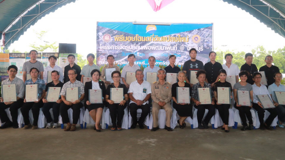 จันทบุรี 26 พ.ค.- อธิบดีกรมโยธาธิการและผังเมืองมอบโฉนดที่ดินแปลงใหม่ ตามโครงการจัดรูปที่ดินเพื่อการพัฒนาพื้นที่ 36 แปลง ระบุ ช่วยพัฒนาและแก้ไขผังเมืองอย่างเป็นระบบ ลดงบประมาณการเวนคืนที่ดิน
