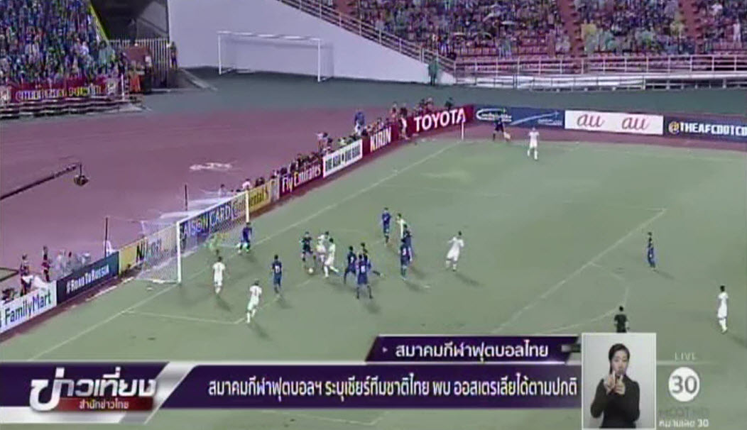 สมาคมกีฬาฟุตบอลไทยฯ 3 พ.ย.- โฆษกสมาคมกีฬาฟุตบอลแห่งประเทศไทยฯ ชี้แจงการเข้าชมเกมฟุตบอลโลก 2018 รอบคัดเลือก ระหว่างทีมชาติไทย พบออสเตรเลีย ให้สามารถนำอุปกรณ์เชียร์ และร้องเพลงเชียร์ได้ ตามมติคณะรัฐมนตรี แต่ต้องอยู่ภายใต้กฎระเบียบของเอเอฟซี และฟีฟ่า