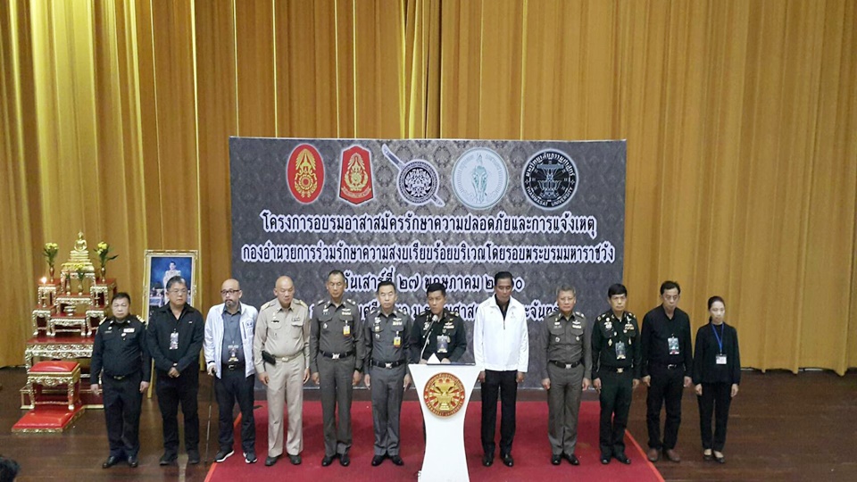 รองแม่ทัพภาคที่ 1 แถลงว่า วันนี้(27 พ.ค.) อบรมอาสาสมัครฯ 2 รุ่น วัตถุประสงค์เพื่อให้ประชาชนร่วมกันเป็นผู้ช่วยเจ้าหน้าที่ ผู้ช่วยเจ้าพนักงาน ในการอำนวยความสะดวกพี่น้องประชาชนที่มาถวายบังคมพระบรมศพ พระบาทสมเด็จพระปรมินทรมหาภูมิพลอดุลยเดช ณ พระบรมมหาราชวัง และช่วยกันแจ้งเตือนเมื่อพบเห็นสิ่งผิดปกติ จะได้นำไปสู่การแก้ปัญหาอย่างรวดเร็ว ทั้งนี้ กอร.รส.จะเปิดเบอร์โทรศัพท์และแอพพลิเคชั่นไลน์ เพื่อให้ประชาชนช่วยกันแจ้งเบาะแส ส่วนกล้อง CCTV จำนวน 13,500 ตัวรอบพื้นที่สนามหลวง ขณะนี้กำลังประสานทุกหน่วยงานที่เกี่ยวข้องรวมถึงร้านค้า ประชาชนเชื่อมต่อข้อมูลกับกอร.รส.