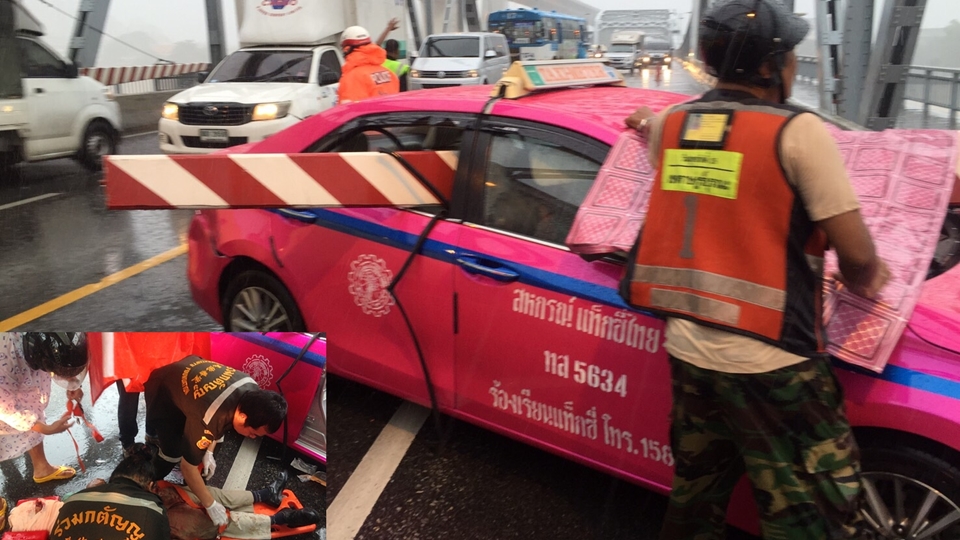 ผู้สื่อข่าวรายงานว่า เมื่อช่วงเช้าที่ผ่านมา ขณะฝนตกหนัก แท่งเหล็กกั้นสะพาน บนสะพานกรุงเทพ มุ่งหน้าฝั่งธนบุรี ฟาดลงมาทะลุกระจกแท็กซี่ สีชมพู ทะเบียน ทส 5634 กทม.จากด้านหน้าไปหลัง สภาพรถพังยับกระจกหน้าแตกกระจาย ตัวถังรถเบี้ยวส่งผลให้คนขับรถได้รับบาดเจ็บ โชคดีไม่มีผู้โดยสาร