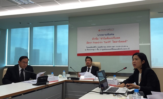 นายวัฒนพงษ์ คุโรวาท ผู้อำนวยการสำนักนโยบายไฟฟ้า สำนักงานนโยบายและแผนพลังงาน (สนพ.) กล่าวว่า กระทรวงพลังงานปรับอัตราการรับซื้อไฟฟ้าจากพลังงานแสงอาทิตย์รูปแบบสะท้อนต้นทุนที่แท้จริง หรือ Feed in Tariff (FiT) สำหรับผู้ผลิตรายเล็กมาก (VSPP) จากเดิม 5.66 บาทต่อหน่วยปี 2557 มาอยู่ที่ 4.12 บาทต่อหน่วยในปี 2559 โดยอัตรานี้คาดว่าจะใช้ไปจนถึงปี 2561 และหลังจากนั้นจะคำนวณต้นทุนใหม่เพื่อกำหนด FiT ให้เหมาะสมอีกครั้งและใช้ในปี 2562