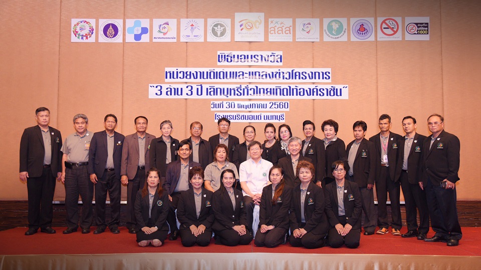 นพ.โสภณ เมฆธน ปลัดกระทรวงสาธารณสุข (สธ.) พร้อมด้วยนพ.เจษฎา โชคดำรงสุข อธิบดีกรมควบคุมโรค นพ.บัณฑิต ศรไพศาล รองผู้จัดการกองทุนสนับสนุนการสร้างเสริมสุขภาพ (สสส.)มอบรางวัลหน่วยงานดีเด่น โครงการ 3 ล้าน 3 ปี เลิกบุหรี่ทั่วไทย เทิดไท้องค์ราชัน เพื่อร่วมถวายเป็นพระราชกุศลและน้อมรำลึกถึงพระมหากรุณาธิคุณแด่ พระบาทสมเด็จพระปรมินทรมหาภูมิพลอดุลยเดช รัชกาลที่ 9