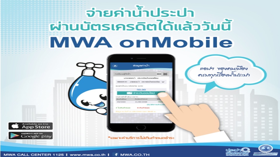 ล่าสุด กปน.เพิ่มบริการใหม่ โดยการพัฒนาแอพฯ MWA onMobile ให้รองรับการชำระเงินค่าน้ำประปาผ่านบัตรเครดิต (VISA , Master Card) กปน. จึงขอเชิญชวนให้ประชาชนดาวน์โหลดแอปฯ MWA OnMobile เพื่อความสะดวกในการใช้น้ำในยุคดิจิตอล เพื่อให้ผู้ใช้น้ำได้รับบริการที่สะดวก รวดเร็ว พร้อมทั้งตอบสนองนโยบายที่เกี่ยวกับ Digital Economy ของรัฐบาลอีกด้วย โดยผู้ใช้น้ำสามารถดาวน์โหลดแอพฯ ได้ฟรีที่ App Store และ Play Store.-สำนักข่าวไทย