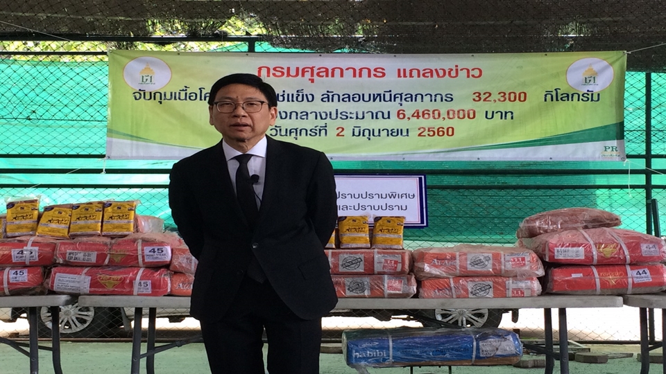 นายกุลิศ สมบัติศิริ อธิบดีกรมศุลกากร แถลงจับกุมเนื้อโคและกระบือนำเข้าจากต่างประเทศโดยหลบเลี่ยงภาษีนำเข้า ได้ภายในห้องเย็นในจังหวัดอุดร