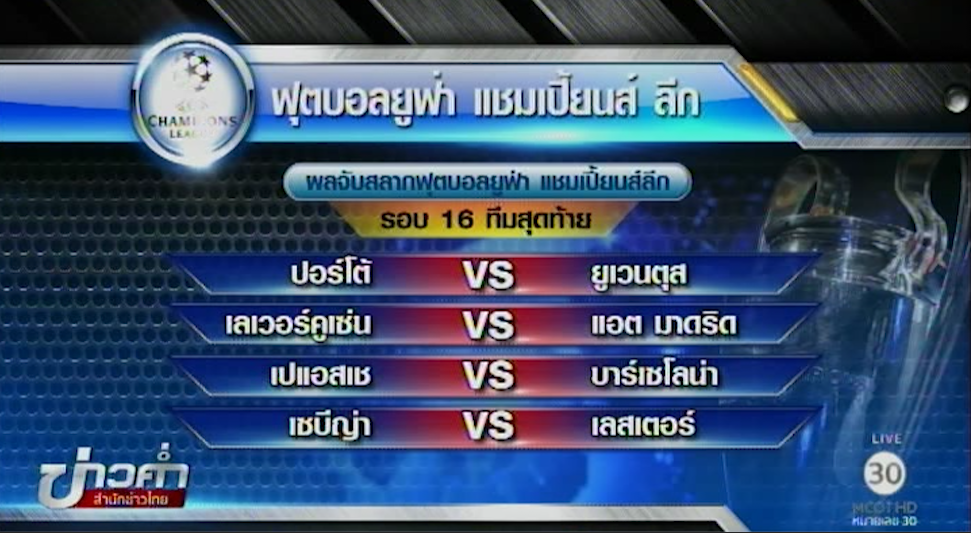 ผลจับสลากฟุตบอลยูฟ่า แชมเปี้ยนส์ลีก รอบน๊อคเอ้าท์ 16 ทีมสุดท้าย แมนเชสเตอร์ ซิตี้ จากอังกฤษ พบ โมนาโก จากฝรั่งเศส, เรอัล มาดริด แชมป์เก่าจากสเปน พบ นาโปลี จากอิตาลี, เบนฟิก้า จากโปรตุเกส พบ โบรุสเซีย ดอร์ทมุนด์ จากเยอรมนี, บาเยิร์น มิวนิค จากเยอรมนี พบ อาร์เซน่อล จากอังกฤษ, ปอร์โต้ จากโปรตุเกส พบ ยูเวนตุส จากอิตาลี, เลเวอร์คูเซ่น จากเยอรมนี พบ แอตเลติโก้ มาดริด รองแชมป์เก่าจากสเปน, ปารีส แซงต์ แชร์ก แมง จากฝรั่งเศส พบ บาร์เซโลน่า จากสเปน, เซบีญ่า จากสเปน พบ เลสเตอร์ ซิตี้ จากอังกฤษ